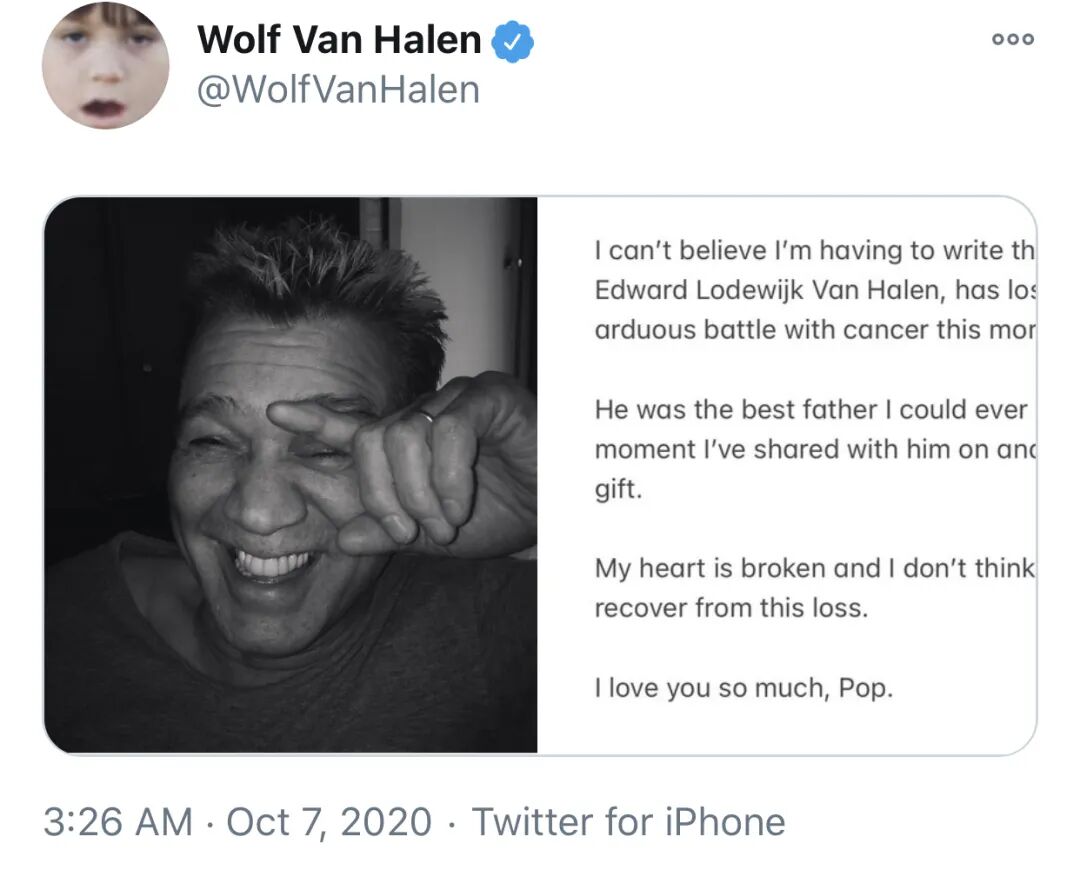 他的儿子Wolf Van Halen发文,称父亲是因癌症离世。