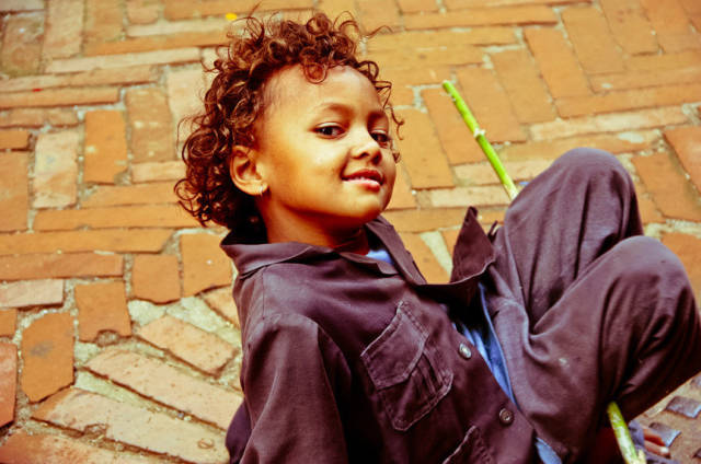 走在城中窄巷里,黑暗的楼洞里时不时飞出一只足球,后面追随着几个穿着破旧球鞋的小孩。在楼檐狭小的空地上打着板球的小孩子,会窜到游客面前嬉笑着问好。各种神庙神龛隔出来的天井或小广场,随处可见小孩子奔跑打闹的身影。虽然他们大多身形瘦小,衣衫也说不上多么整洁漂亮,但他们很坦然享受地生活着,既不羞怯也不畏缩,浑身洋溢着简单的快乐。