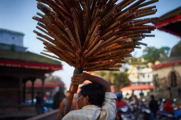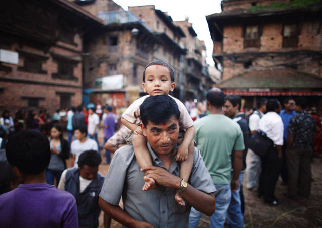 一对父子参加巴德岗古城中的Ghantakarna节活动,人们会在这一天焚烧恶魔Ghantakarna的雕像,象征着毁灭邪恶