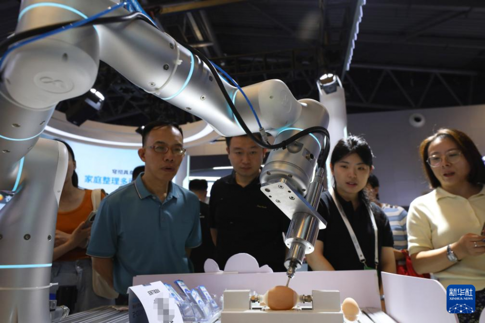 7月29日,参观者在一个进行蛋壳雕刻的机器人前驻足。