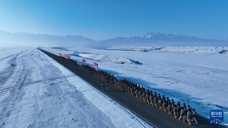 1月4日,武警兵团总队某部官兵在天山脚下组织徒步行军(无人机照片)。