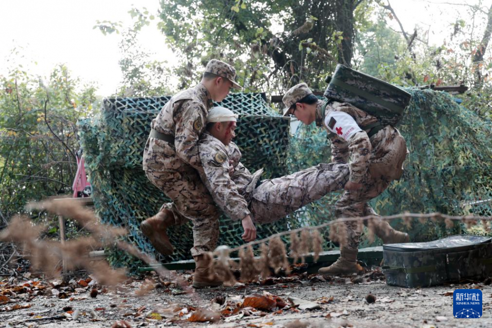 1月5日,武警湖南总队医院开展实战化卫勤训练,医疗队员在转运一名“伤员”。