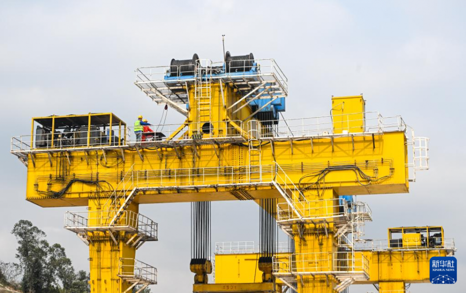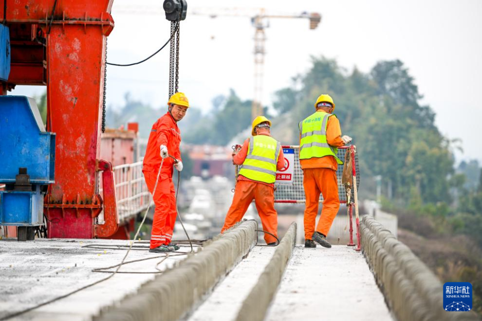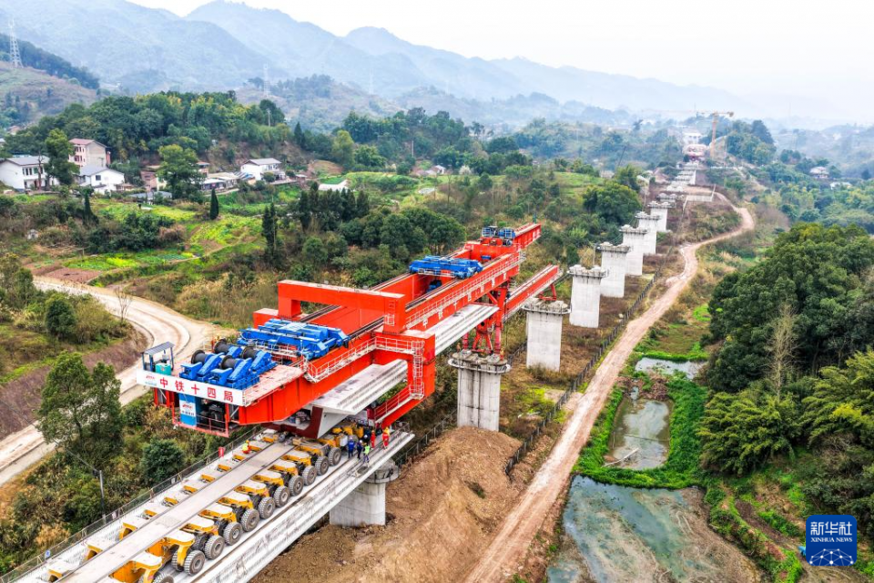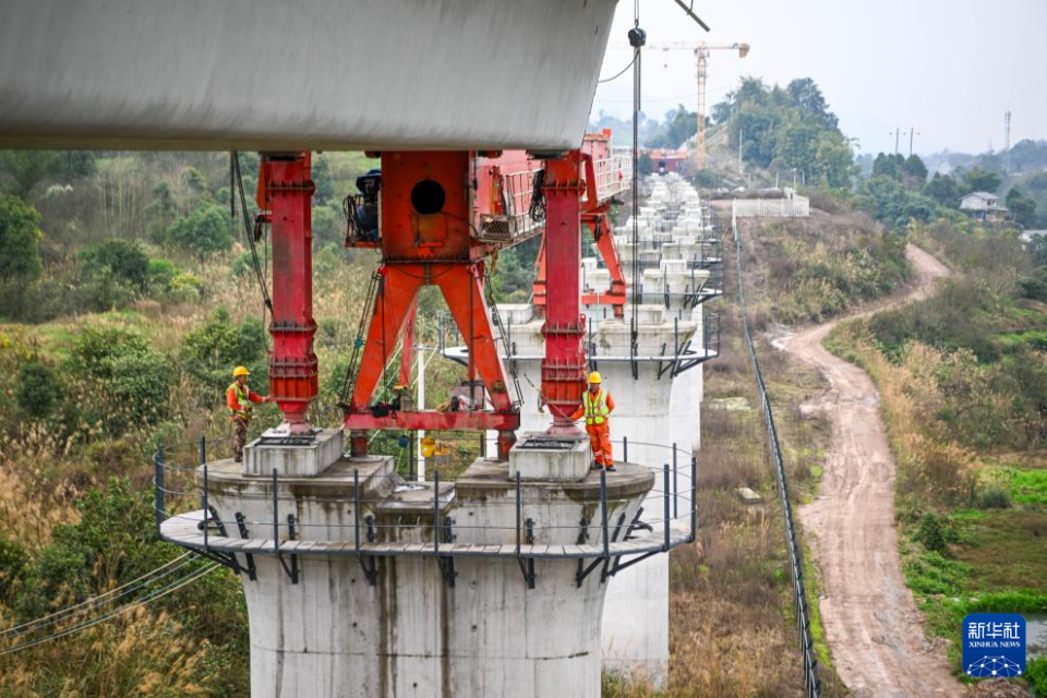 2月26日,在重庆市合川区清平镇的西渝高铁建设工地,工人在进行架梁作业。